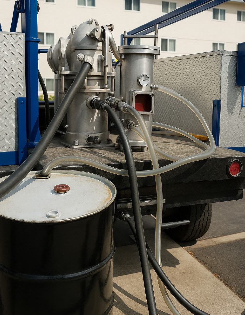 Filtration of a diesel day tank generator at the Penthouse of a high rise building using a portable fuel filtration. Day tanks are the source of contaminating diesel & rusting. This is caused by forming acid that dissolved the iron from day tank walls. See before & after photos.