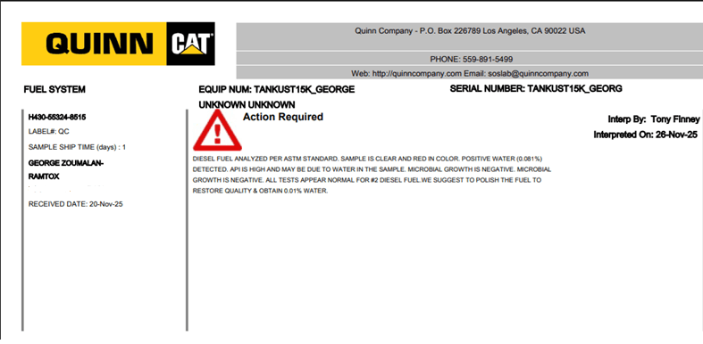 Ramtox offers visual fuel inspections and provides ASTM fuel testing reports through certified laboratory analysis. These tests determine the quality of your fuel and verify whether it meets the required ASTM standards and methods. Attached is a sample testing model and Quinn Lab result.